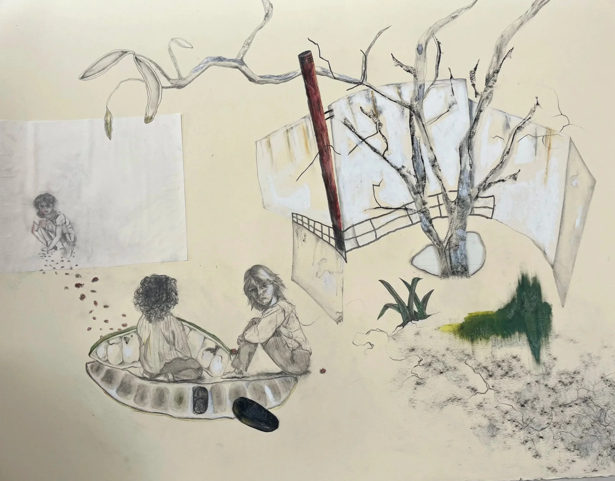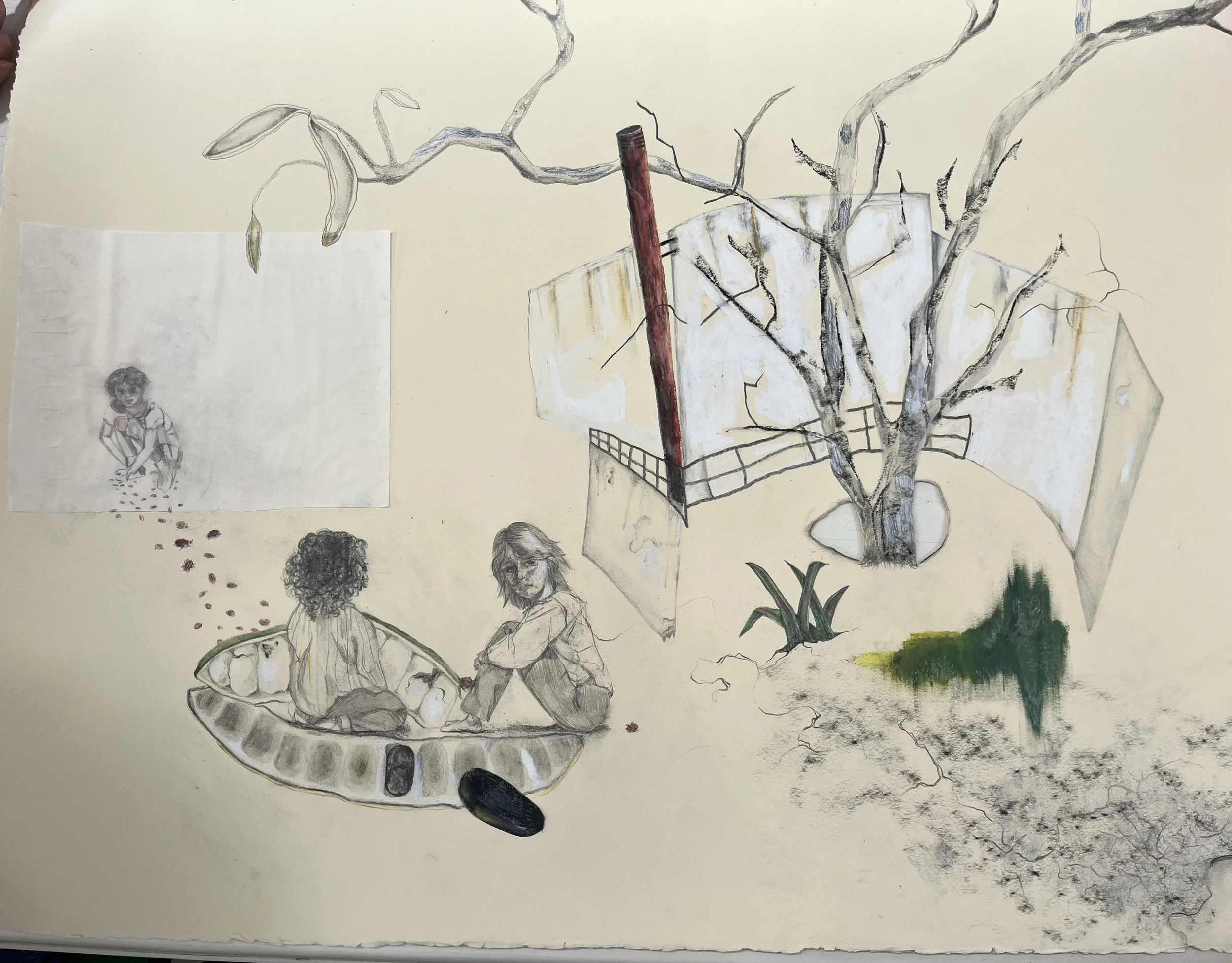 The drawing collages were made on rice letter paper found in the site 6 years prior to the exhibition, owned by the previous owner of the house, Carlota. The collages also include paint chips, dirt, molded paper and materials collected from the sites drawn.